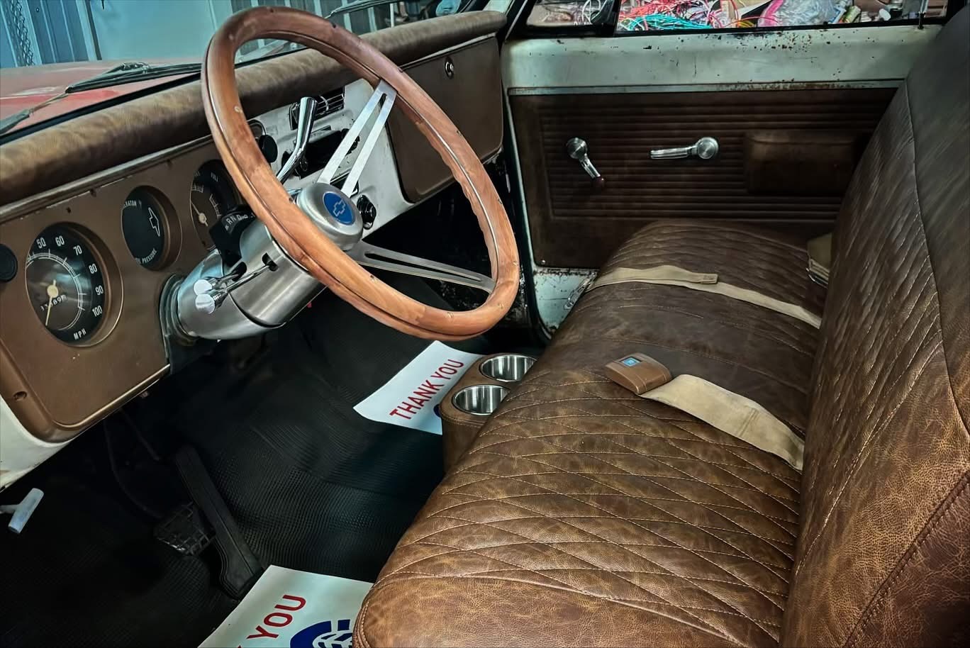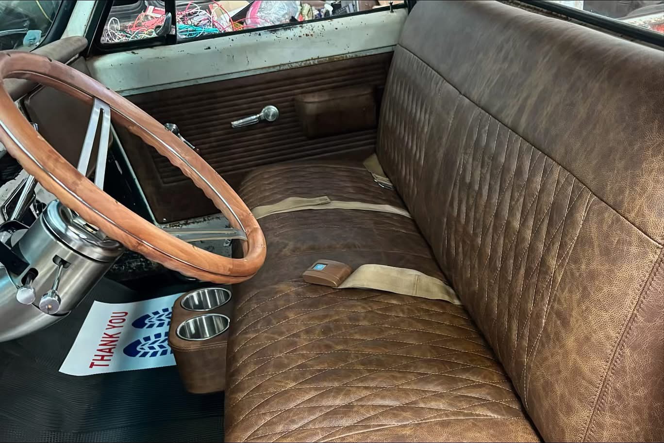 One Amazingly Authentic Patina Showing Years of Use and Love, Making It Extremely Unique. Smooth 350 Running and Nicely Detailed 350 V8 w/ Recent Reseal. Brand New 700R4 Overdrive Automatic Transmission. New Rear End, Equipped with 3.73 Gears for Better Cruising Power Edelbrock Intake Manifold, New HEl Distributor, For smoother and more reliable ignition. Brand New Gas Tank. Hideaway Radio System, Mounted under the Seat. Everything Works! Full Custom Interior, Seat, Dash, and Door Panels all Done in Distressed Leather! Vintage Air, Heat and Cold AC!