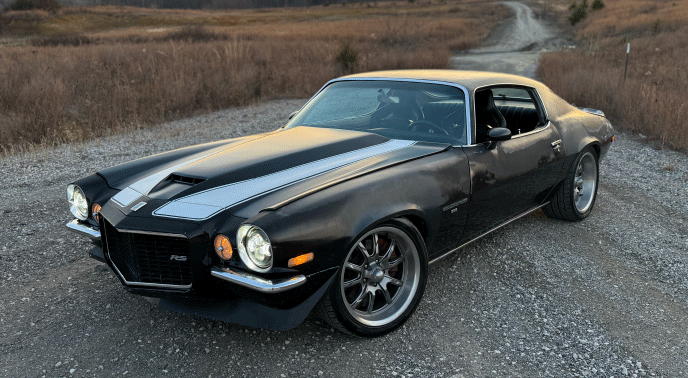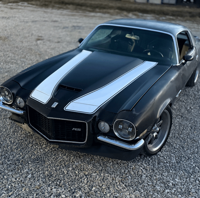 Wicked Patina Road Warrior 1971 RS Split Bumper Camaro. Patina Muscle! Resto Mod! Real Deal Car! Rowdy Cammed 5.3 LS with a Super T/10 Manual Transmission, (3 Pedals!). Vintage Air AC! Corbeau Race Seats with 4-point harness. Slotted and Drilled Disc Brakes. Pro Touring Hood.