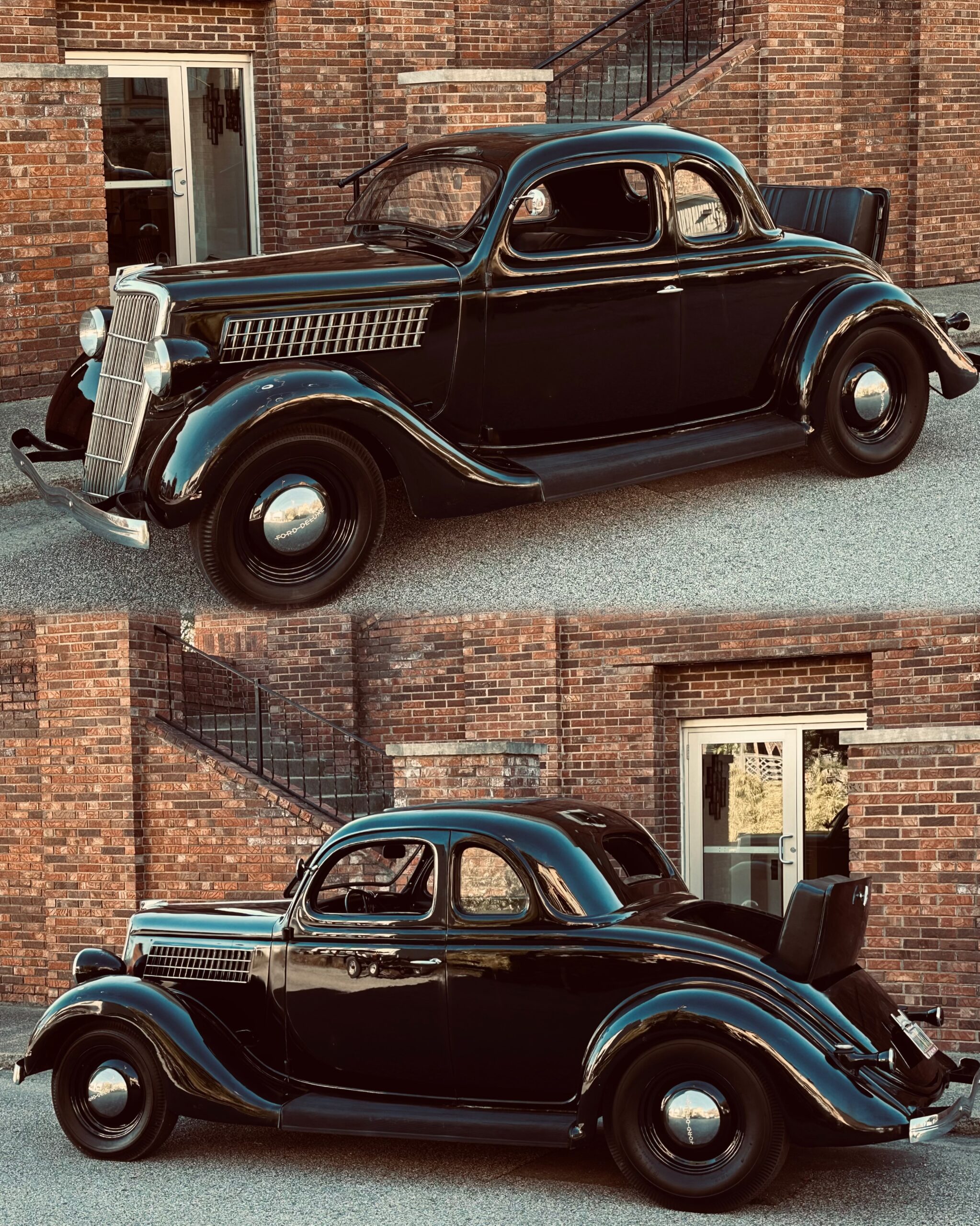 1935 Ford Rumble Seat Coupe, Straight and Solid. Hopped Up…! Aluminum Cheater Heads on 1950’s Flathead with Dual Carbs. 12v Conversion, Old Lacquer Paint!! Nice Black Interior, Drive Anywhere! Amazing Car!